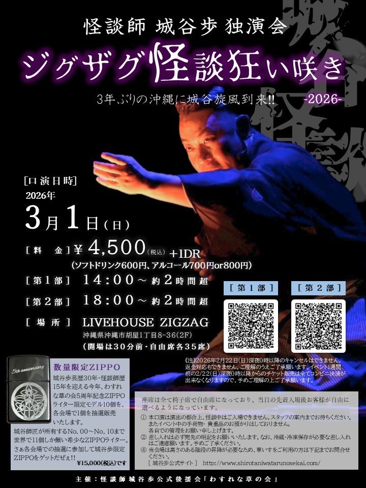 城谷歩公式後援会わすれな草の会主催沖縄独演会 【ジグザグ怪談狂い咲き2026】城谷歩公式後援会わすれな草の会主催沖縄独演会 【ジグザグ怪談狂い咲き2026】